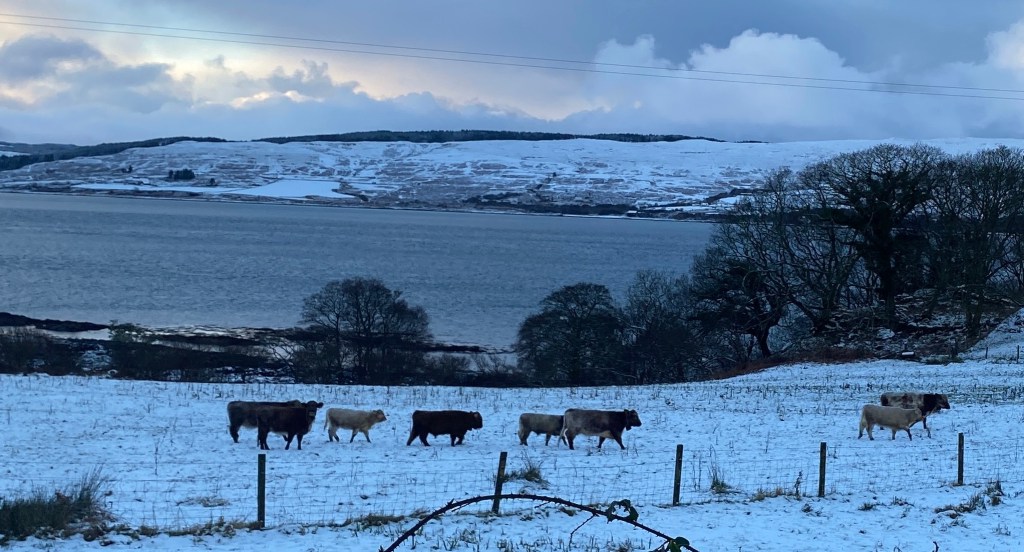 As I write, the croft is covered in snow for the second time this winter. The cows are attuned to any stirring from our house and march across the fields for their hay before we’re fully dressed.