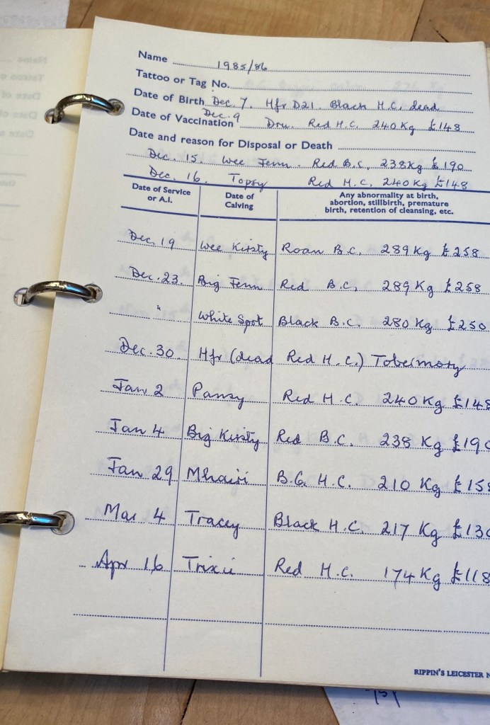 Betty’s cows were a similar breed. Like us, she gave each one a name. She kept a record of the calves each year and sometimes the prices at sales (how different the economics are now!). She had some cows on her croft for over twenty years and we hope some of ours will be with us that long too. (I think Betty would have approved of our attachment to them.)
